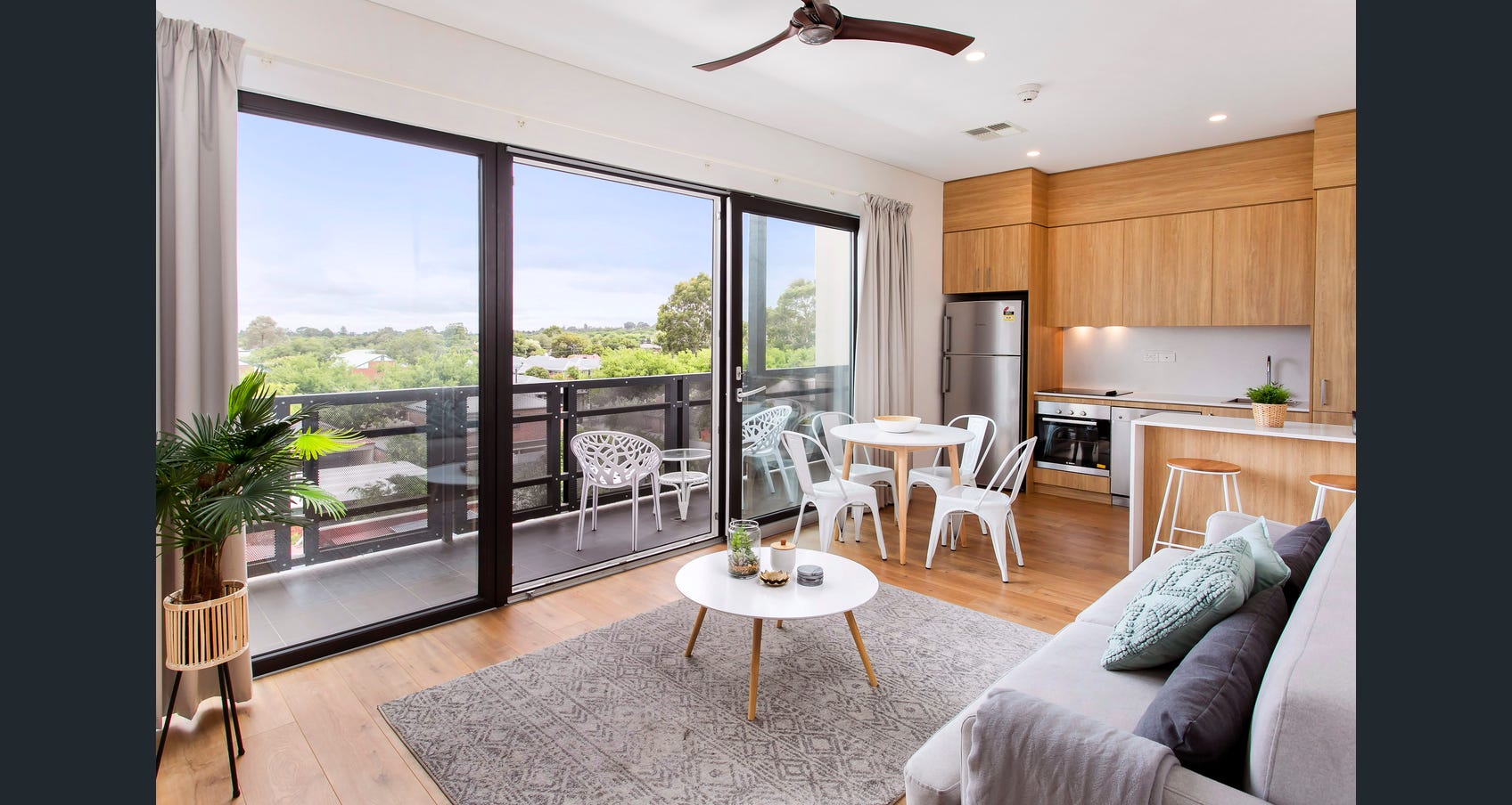 Light-filled open plan living, dining, and kitchen area